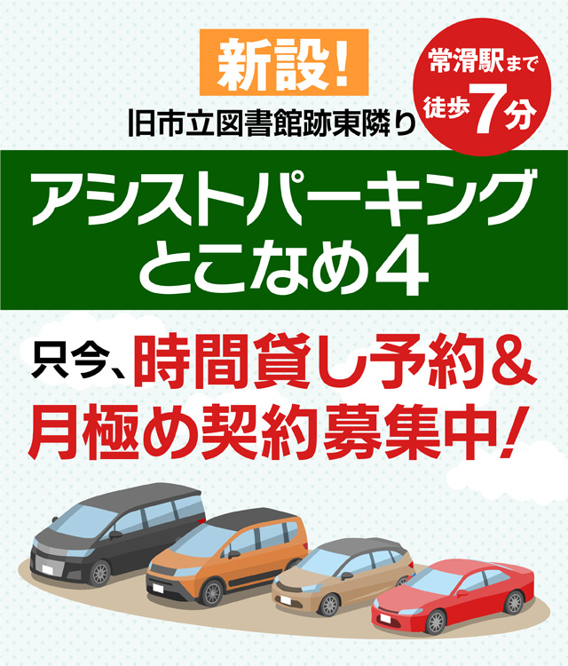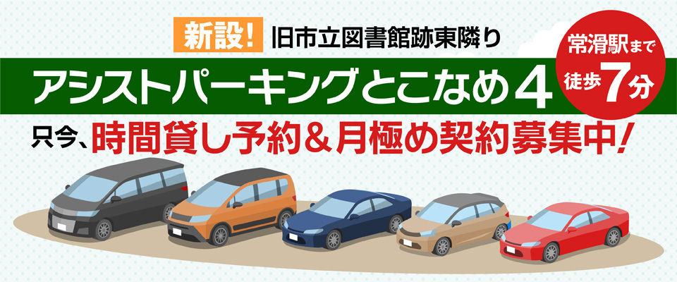 名鉄常滑駅から徒歩10分以内に3つのパーキング。コインパーキング(時間貸し)と月極契約駐車場を完備しています。電車でセントレアからの旅行がとってもお得!